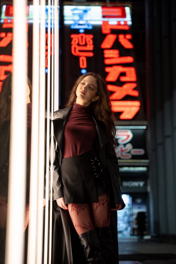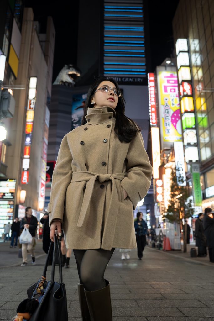 The best way to shoot here is to zoom in rather than going too wide. A tighter focal length makes the Yodobashi neon look larger and more powerful in the background, which gives the image much more impact. This is also a good place to play with reflections, negative space, and slightly moodier poses. If you place yourself right next to the light wall and keep the framing tight, this spot can produce some of the strongest night portraits in Shinjuku.
