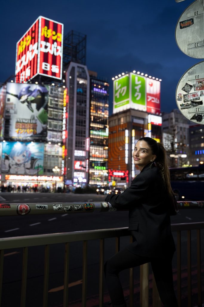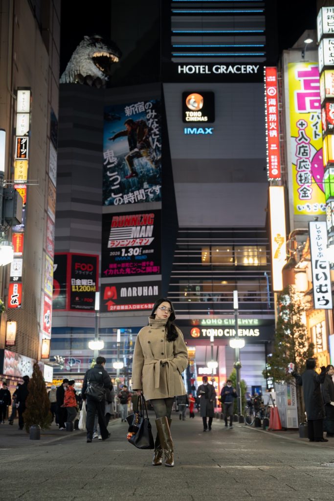 The best way to shoot here is from a lower angle, pointing slightly upward. That makes the neon letters feel bigger in the frame and gives the portrait more energy. It works especially well for a tighter portrait or a three-quarter shot where the signage fills the background. If you want something bright, modern, and distinctly urban, this is one of the strongest final spots to include in a Shinjuku night photo route.