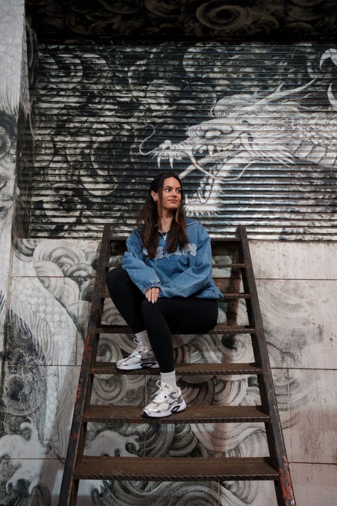This place works best when you keep the composition simple and let the wall art do the work. Sitting on the stairs is especially effective because it naturally centers you in front of the dragon and gives the frame more structure. It is also one of the most original spots in this guide because it adds a completely different mood to a Shinjuku night shoot.