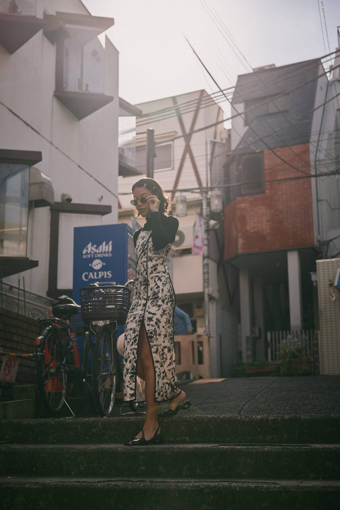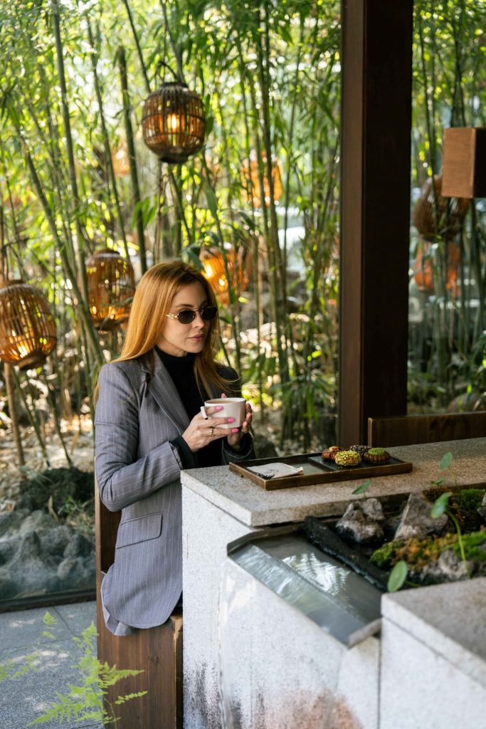 In this shot, the model’s quiet expression, elegant outfit, and the lush green backdrop all work together to create a beautiful moment of stillness. It’s the kind of photo that tells a story—of comfort, of mindfulness, of travel at a slower pace.