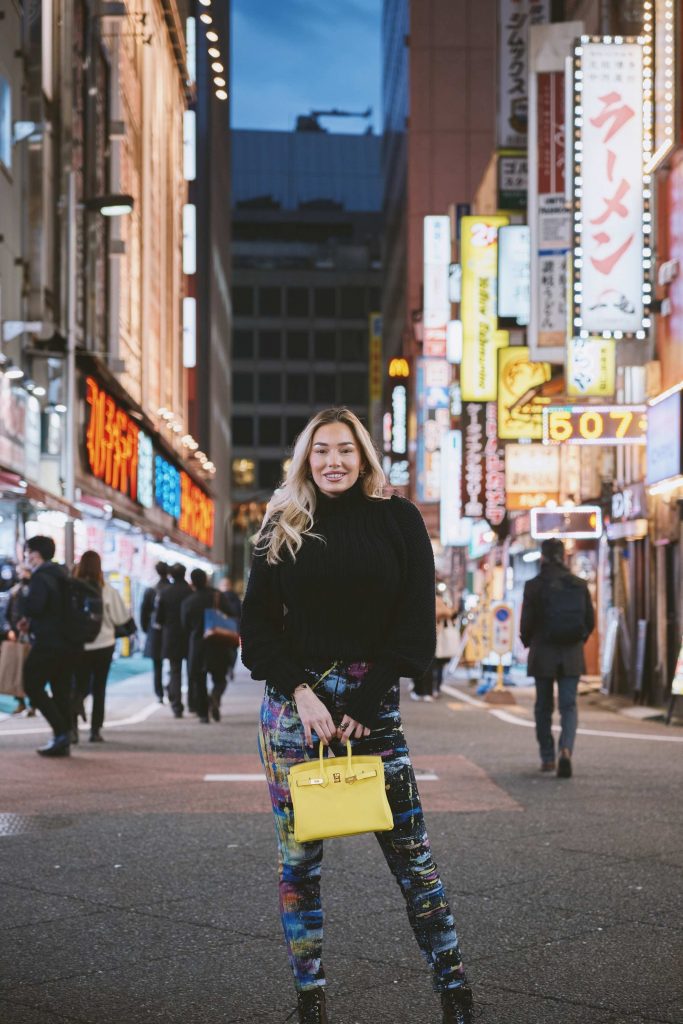 In this image, the umbrella, thigh-high boots, and moody nighttime rain of Shibuya Crossing add cinematic drama, but it’s the strong body line and confident head turn that steal the spotlight. The S-curve naturally draws the viewer’s eye down the frame, creating movement and balance without needing exaggerated gestures.