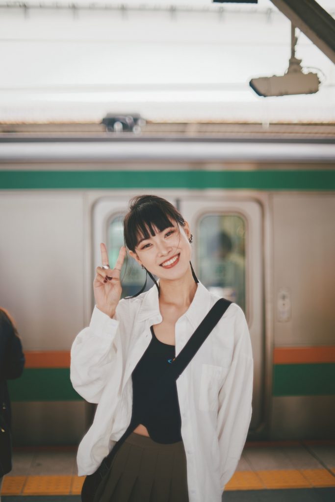 In this shot, the model’s casual outfit, loose white shirt, and train station backdrop make the moment feel like a snapshot from real travel—fun, light, and in the moment. It’s a great way to bring personality into your photos without overthinking your posture.