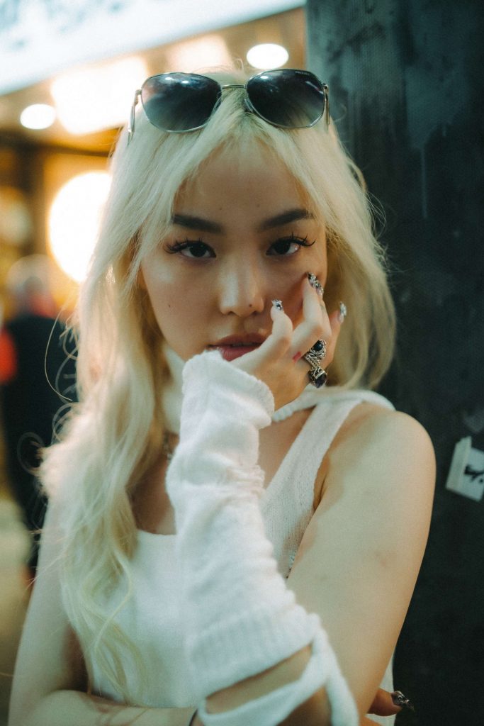 In this photo, the model’s colorful mesh top, sharp sunglasses, and confident posture all combine for a look that’s equal parts fashion editorial and street-style statement. The warm lantern light in the background enhances the contrast and drama.