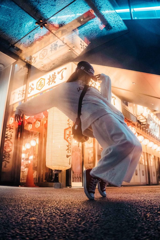 In this photo, the subject’s bent-back silhouette, oversized hoodie, and striking red sneakers create a sculptural outline. The lantern-lit alley and reflective ceiling add a cinematic backdrop that elevates the movement to art.