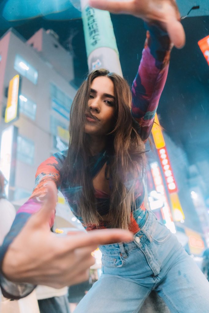 In this photo, the colorful top and slightly tousled hair add energy and texture, while the blurred hands and low angle bring movement and depth. It’s fun, fearless, and ideal for night scenes in neon-lit neighborhoods or places with urban character.